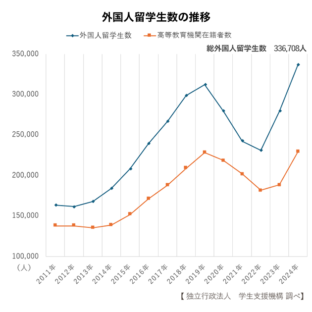 1983年に10,428人であった高等教育機関在籍の外国人留学生数は、2024年には229,464人に、日本語教育機関在籍者も加えると336,708人まで増加しました。
